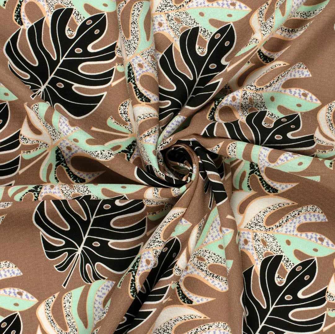 Entdecken Sie die perfekte Harmonie aus Eleganz und Funktionalität mit unserem gewebten Viskose-Leinen-Stoff. Das exquisite Blättermuster in warmen Brauntönen verleiht jedem Projekt eine natürliche Raffinesse. Die hochwertige Mischung aus Viskose und Leinen bietet angenehme Trageeigenschaften, atmungsaktive Qualität und eine wunderbar fließende Drapierbarkeit. Ideal für Kleider, Blusen, Heimtextilien oder kreative Nähprojekte. Ein vielseitiger Stoff, der Stil und Komfort vereint und Ihren Kreationen das gewisse Etwas verleiht.