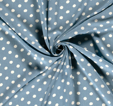 Viskose Borken Crepe bedruckt mit Punkten in der Farbe indigoblau, ist Teil unserer Modestoffe-Kollektion. Dieser Stoff hat eine Breite von 130cm und ein Gewicht von 125g/m2.